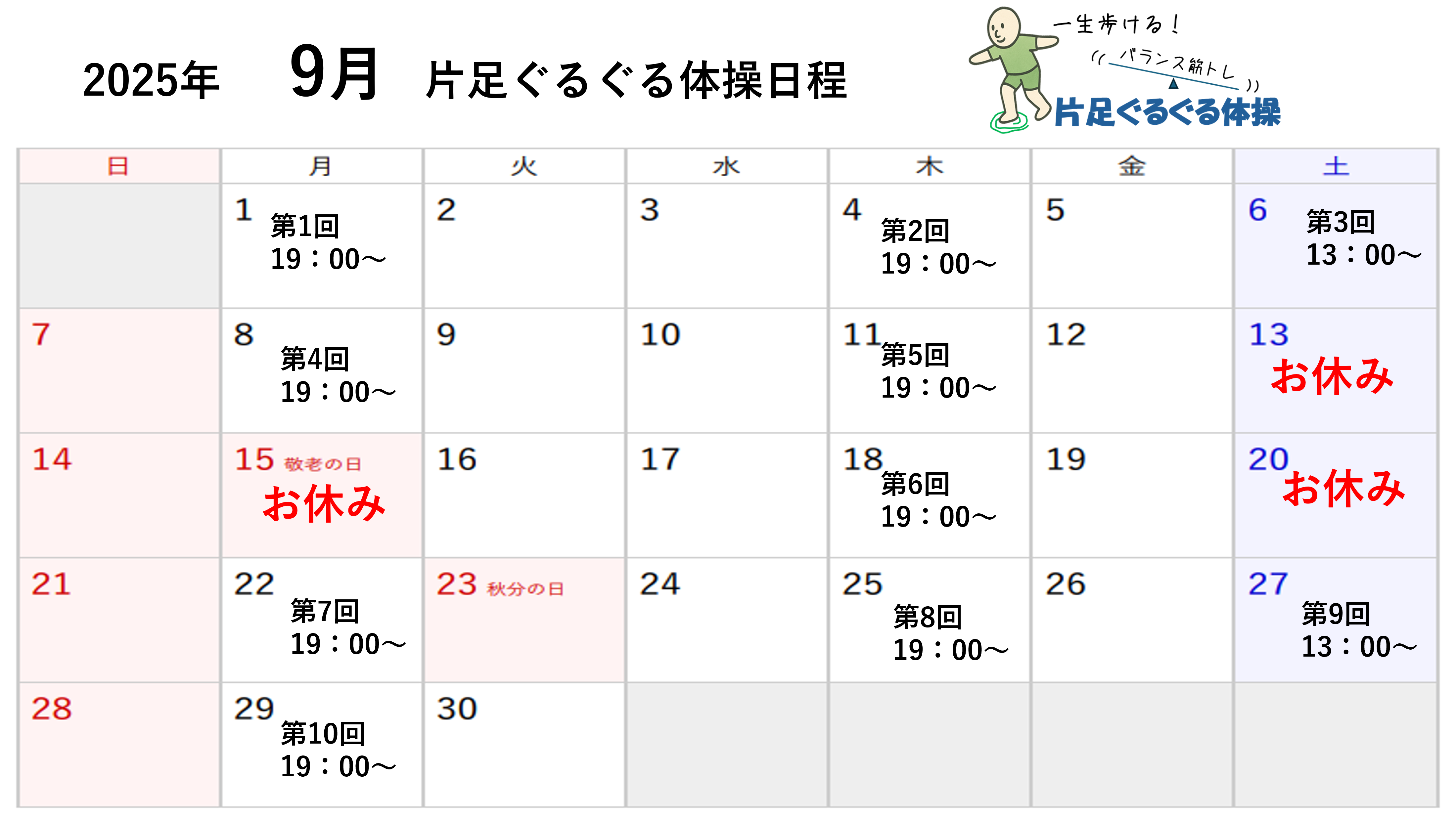 令和7年9月の片足ぐるぐるル体操は以下の日程で行います。