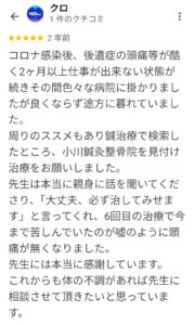 「コロナ感染後、後遺症の頭痛等が酷く2ヶ月以上仕事が出来ない状態が続きその間色々な病院に掛かりましたが良くならず途方に暮れていました。
