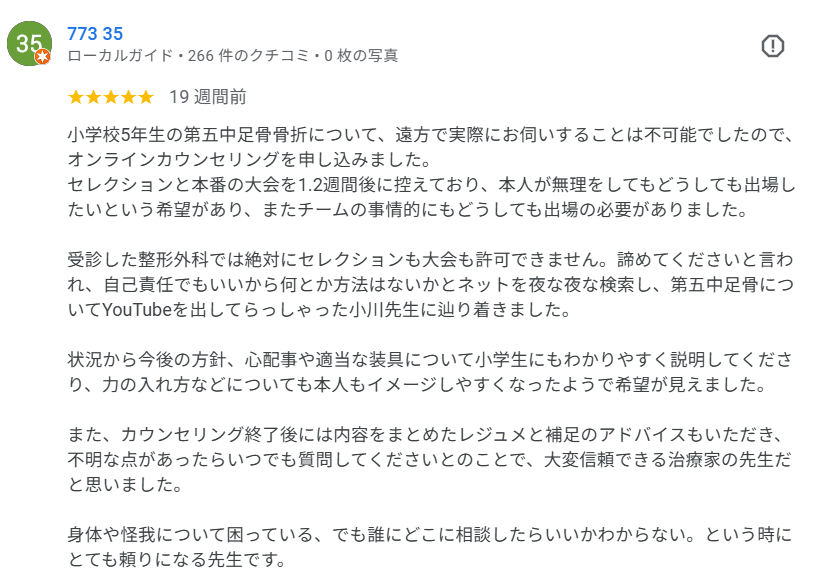 小学校5年生の第五中足骨骨折について、遠方で実際にお伺いすることは不可能でしたので、オンラインカウンセリングを申し込みました。