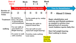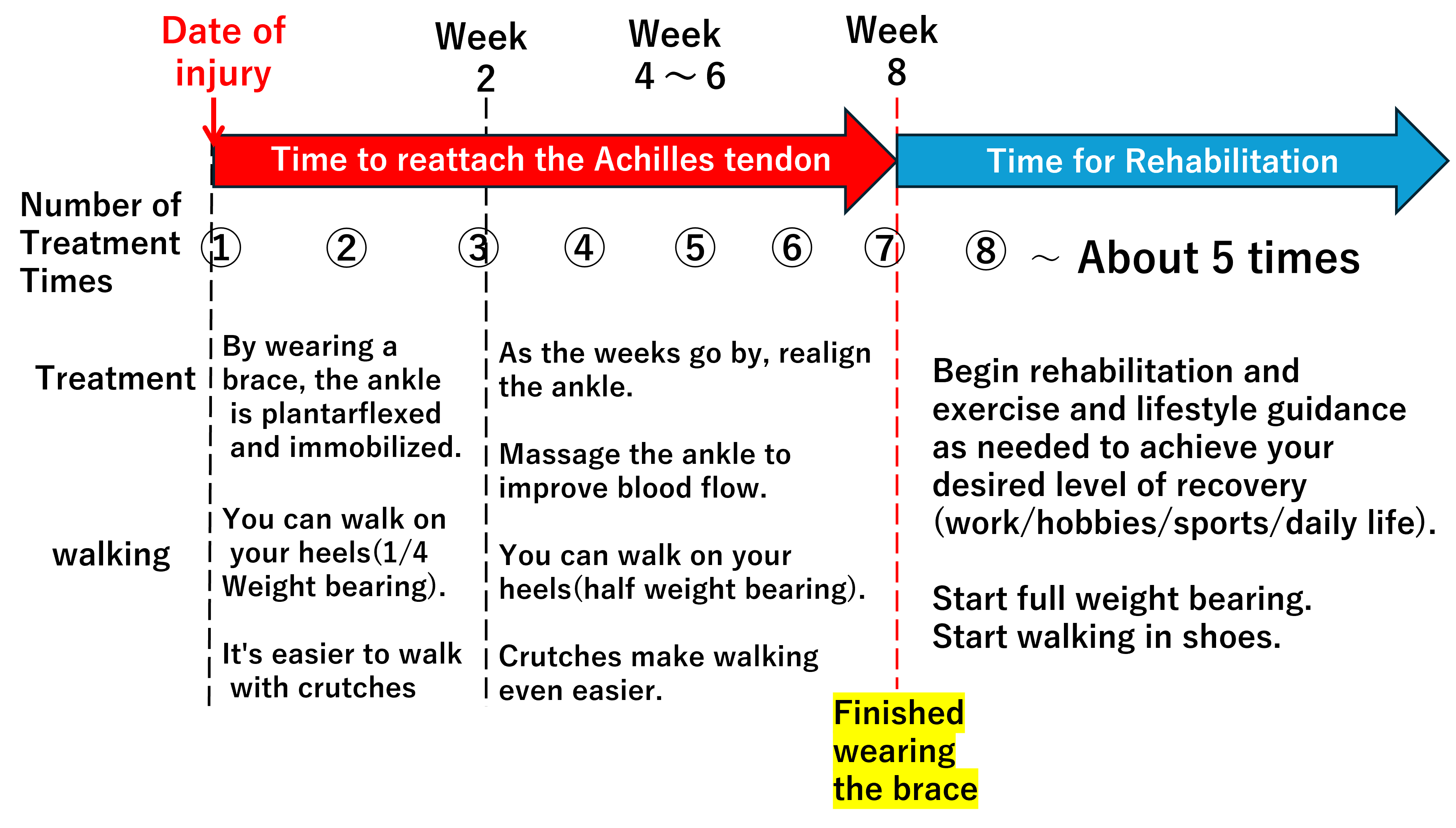 As early as possible after injury, the ankle is placed in plantar flexion and the brace is used to immobilize the tendon. With the brace in place, patients can walk with their weight on their heel (1/4 weight bearing). Using crutches will make walking easier. During this time, you will need to visit the hospital two to three times, including the initial consultation.