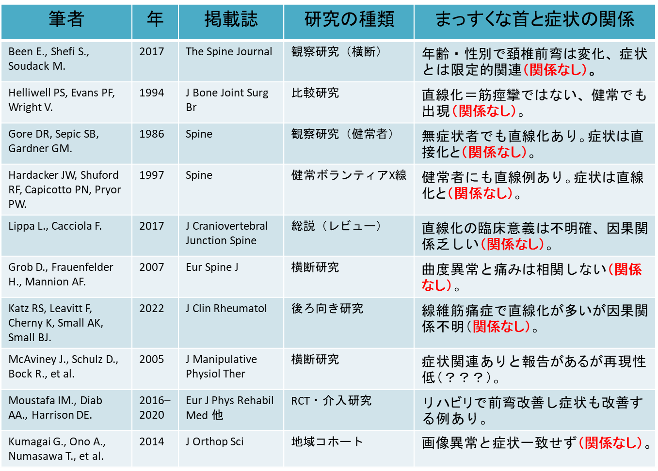 AIが選んだ重要論文10編のうちの8編はまっすぐな首(ストレートネック)と肩こりなどの症状が関係ないことを示しています(文献1~10)。